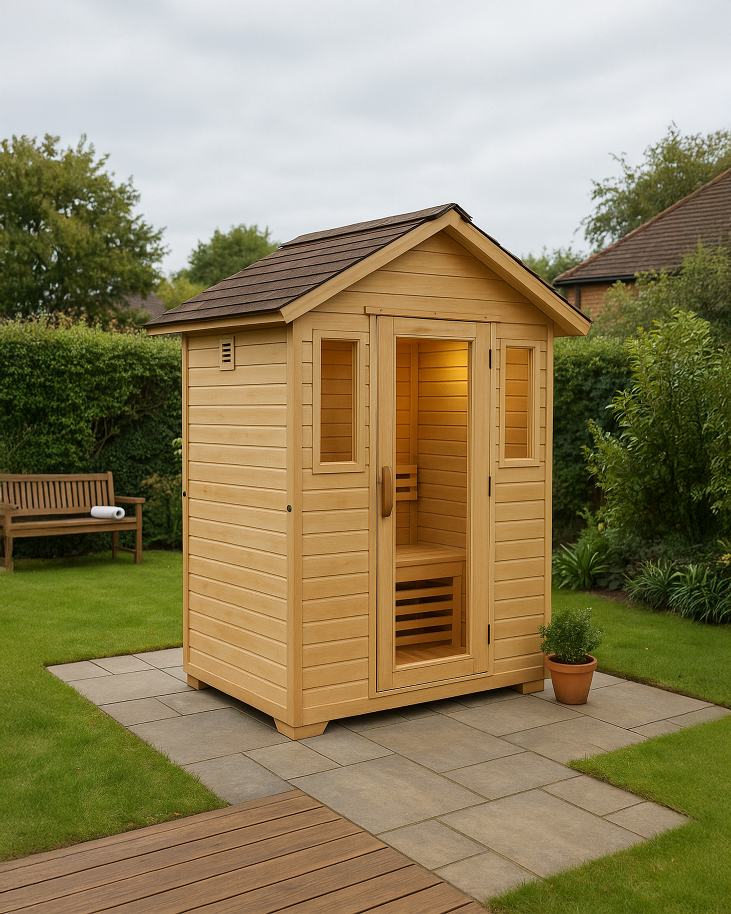 Weatherproof saunas made from premium Canadian Hemlock. Perfect for your patio, garden, or outdoor spa retreat at home.