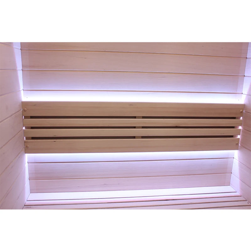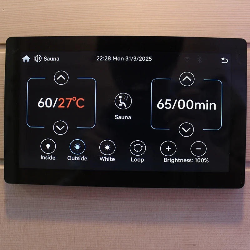 This outdoor sauna is powered by a 3500W Harvia stove, renowned for its reliability and authentic steam sauna experience. The temperature is easily managed through an LCD touch screen control panel, allowing you to set the heat between 18°C to 90°C.